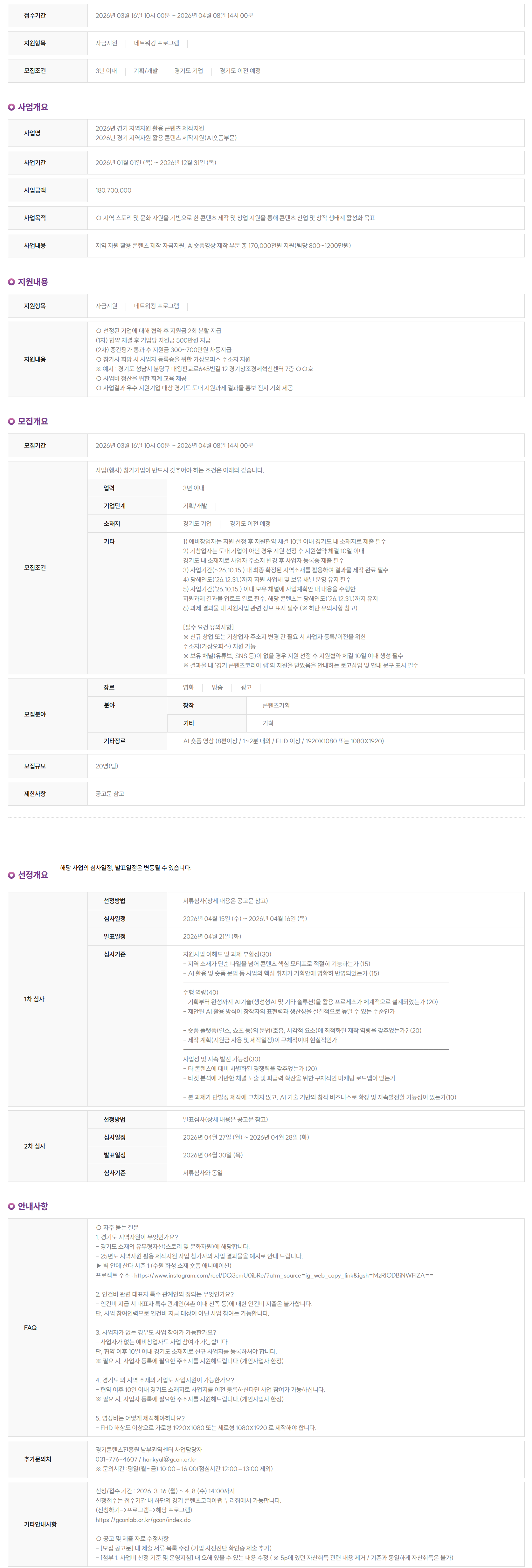[경기콘텐츠진흥원] 2026년 경기 지역자원 활용 콘텐츠 제작지원 지원기업(AI숏폼부문) 모집 공고(~4.8. / 3.26. 영상 비율 상세 수정)