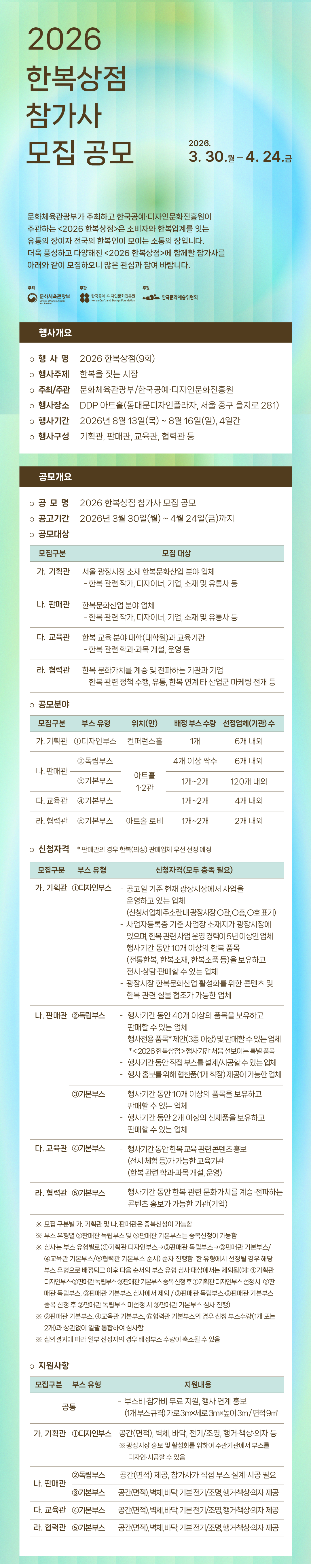 | 문화체육관광부가 주최하고 한국공예·디자인문화진흥원이 주관하는 <2026 한복상점>은 소비자와 한복업계를 잇는 유통의 장이자 전국의 한복인이 모이는 소통의 장입니다. 더욱 풍성하고 다양해진 <2026 한복상점>에 함께할 참가사를 아래와 같이 모집하오니 많은 관심과 참여 바랍니다. |