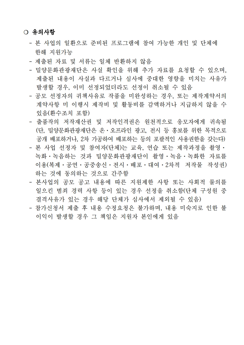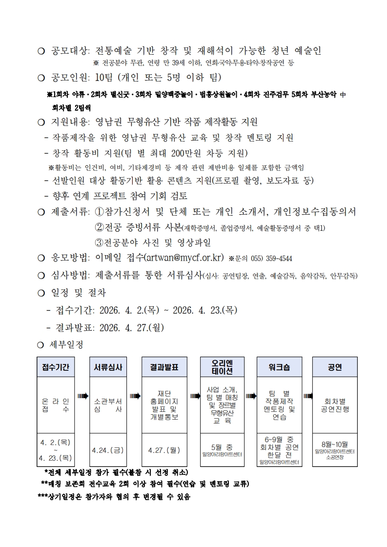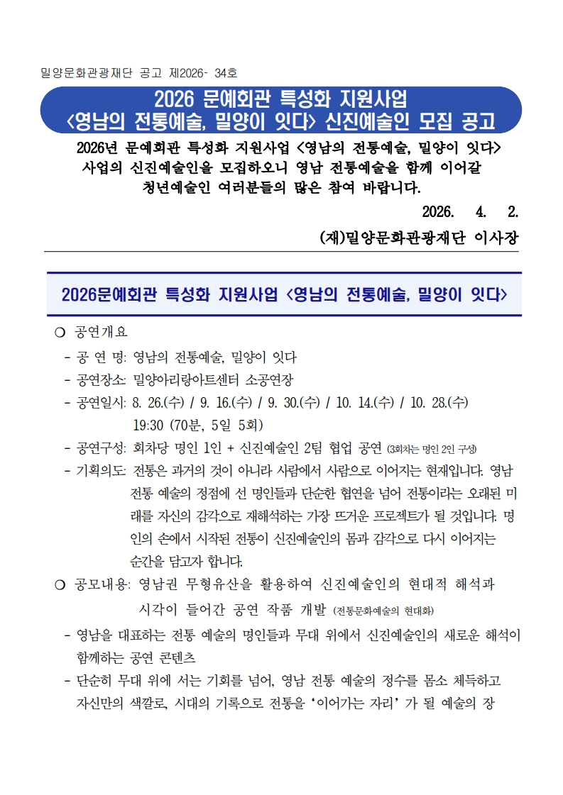 [밀양문화재단] 2026 문예회관 특성화 지원사업 신진예술인 모집 공고