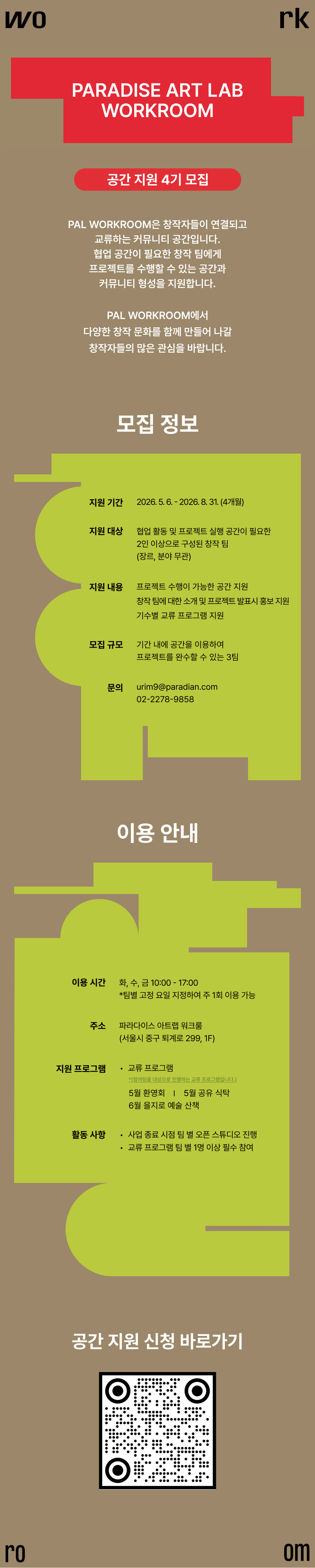 [파라다이스문화재단] PAL WORKROOM 공간 지원 4기 모집