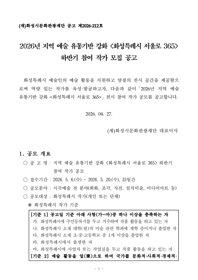 [화성시문화재단] 2026 지역 예술 유통기반 강화 <화성특례시 서울로 365> 하반기 참여 작가 모집 공고