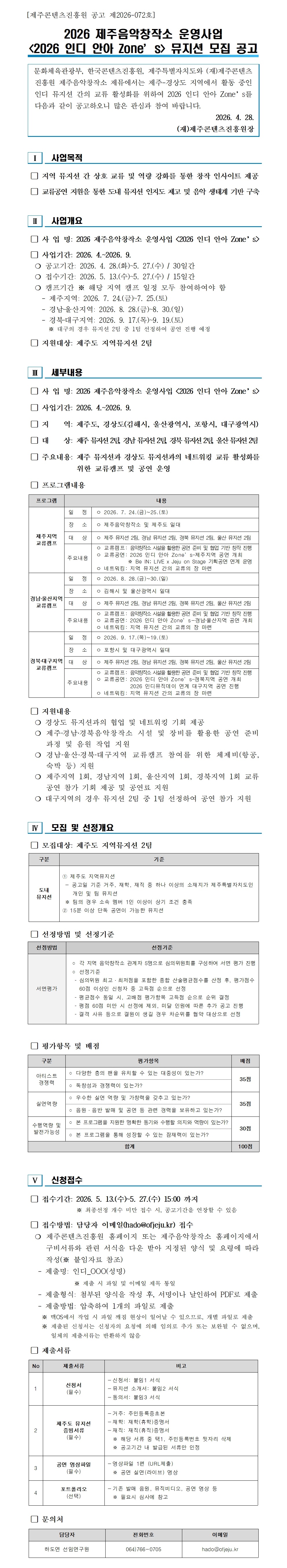 [제주콘텐츠진흥원] 2026 제주음악창작소 운영사업 <2026 인디 안아 Zone's> 뮤지션 모집 공고