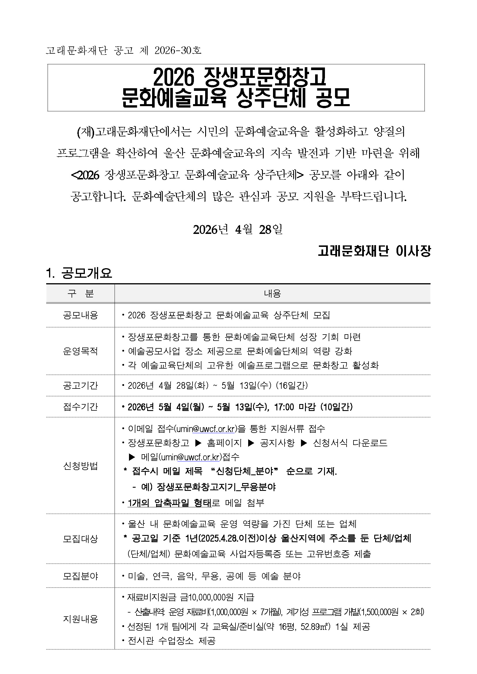[고래문화재단] 2026장생포문화창고 문화예술교육 상주단체 공모